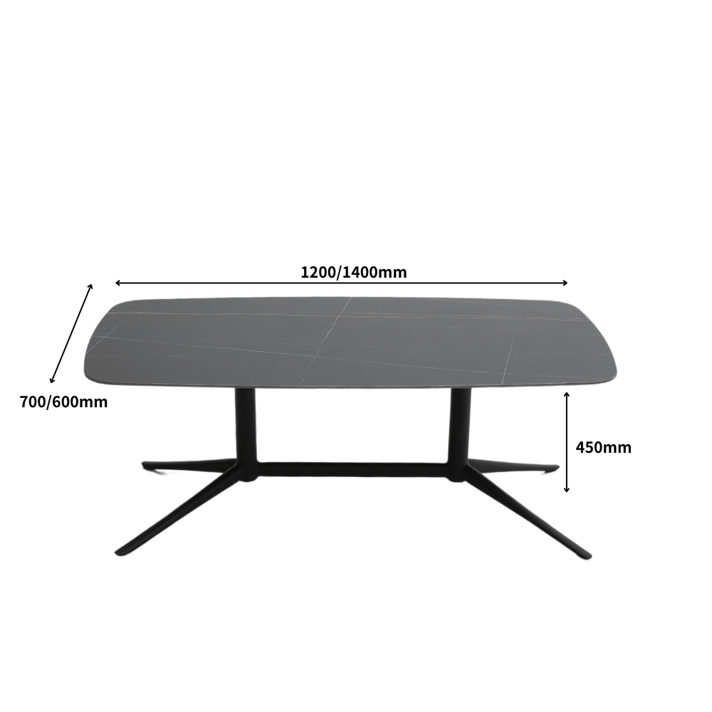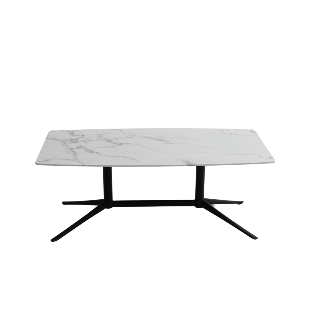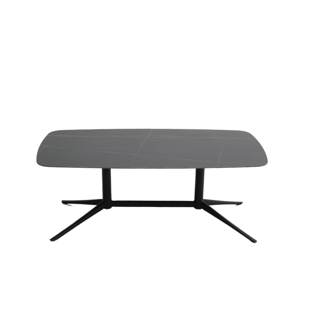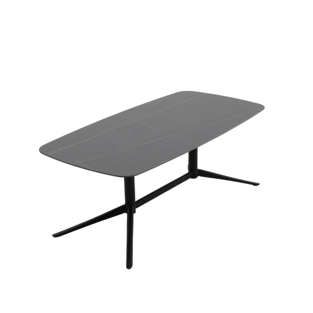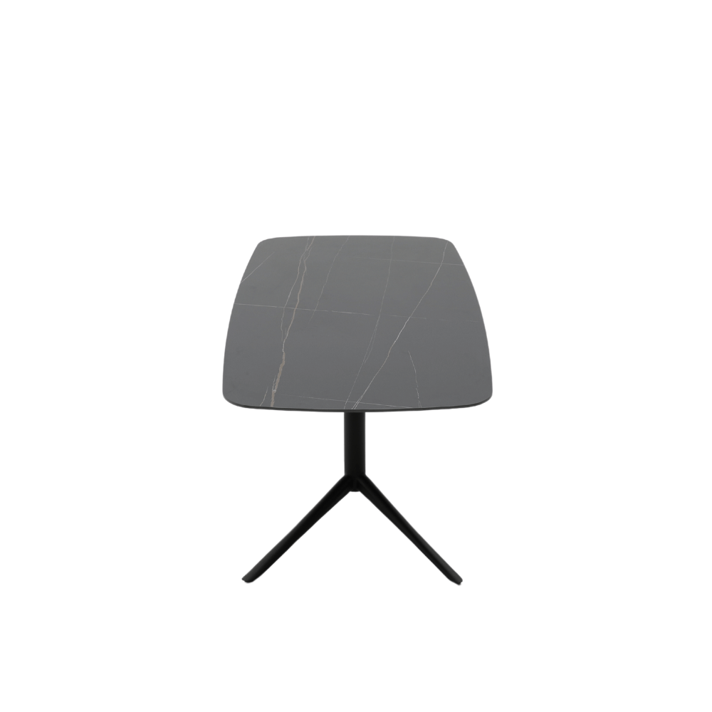 La surface de la table est en pierre frittée, offrant une finition lisse et esthétique. Le piètement est en métal peint, garantissant robustesse et stabilité. Les pieds sont équipés de patins antidérapants pour une utilisation sécurisée sur diverses surfaces.