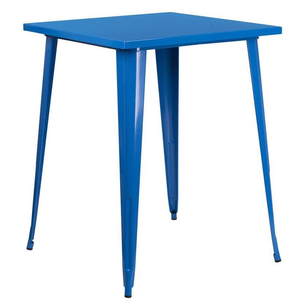 Cette table carrée en métal est conçue pour une utilisation en extérieur et en intérieur, idéale pour les établissements de restauration souhaitant adopter un style industriel,