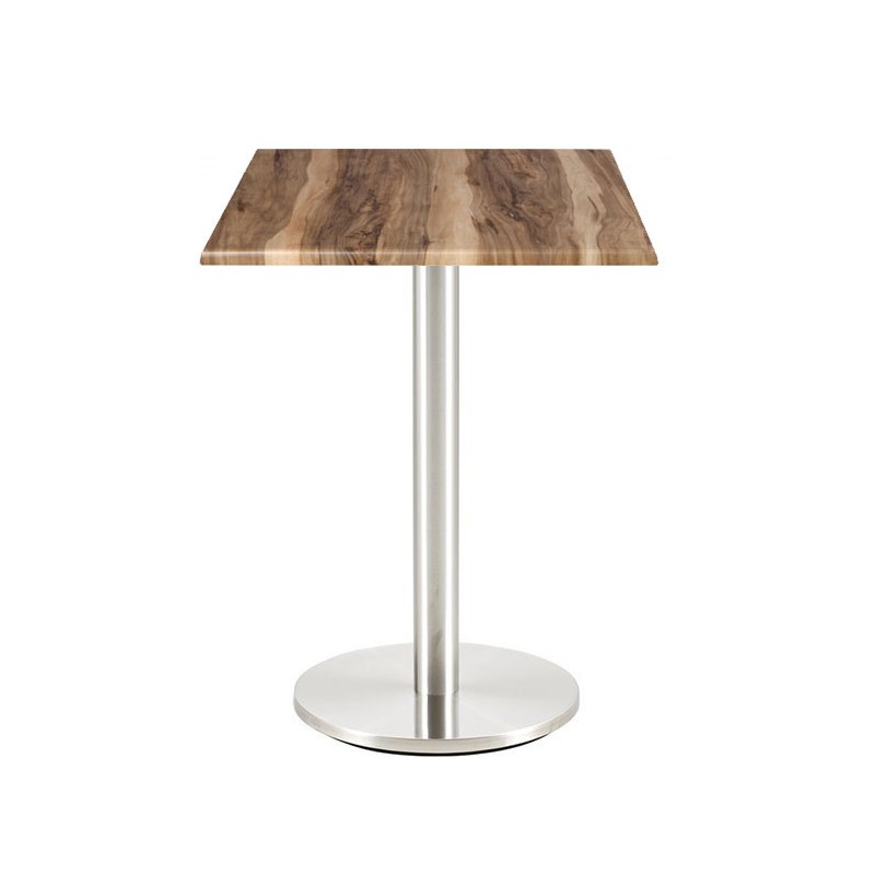 Le piètement central en acier inoxydable, finition satinée, assure une grande stabilité et une excellente durabilité dans le temps. Sa base circulaire de 45 cm de diamètre optimise l’espace au sol tout en garantissant un bon équilibre. Le plateau, proposé avec différentes décorations, apporte une touche esthétique personnalisée, conçue pour résister à un usage intensif en intérieur.