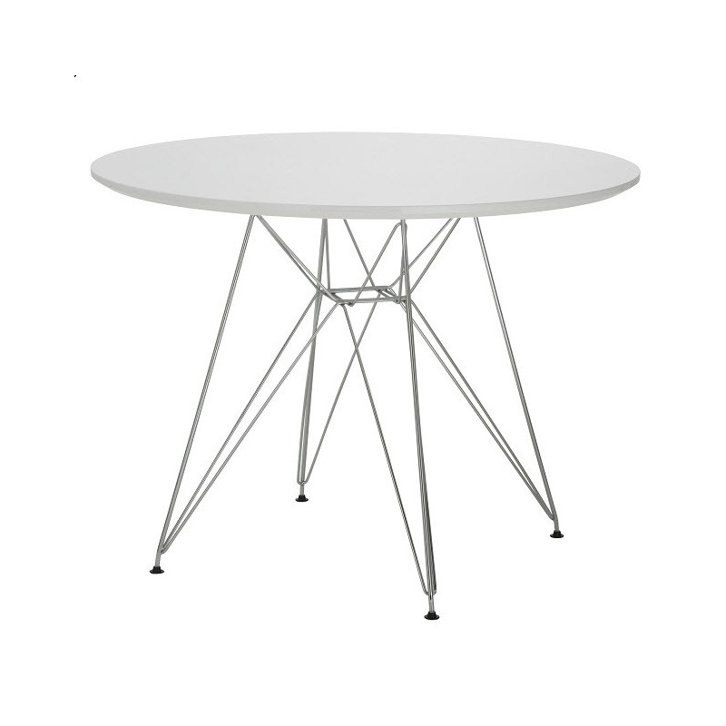 La table repose sur une structure en métal chromé, garantissant robustesse et stabilité. Le plateau est en bois laqué blanc, offrant une surface lisse et facile à entretenir. Ce mariage de matériaux confère à la fois légèreté visuelle et solidité.