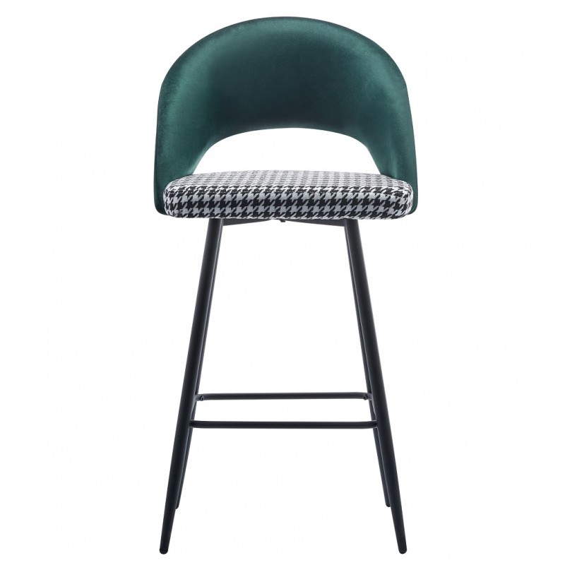 Ce tabouret s’intègre parfaitement aux espaces de restauration, bars et événements, apportant une touche de caractère grâce à son assise tapissée au motif pied-de-poule vert.